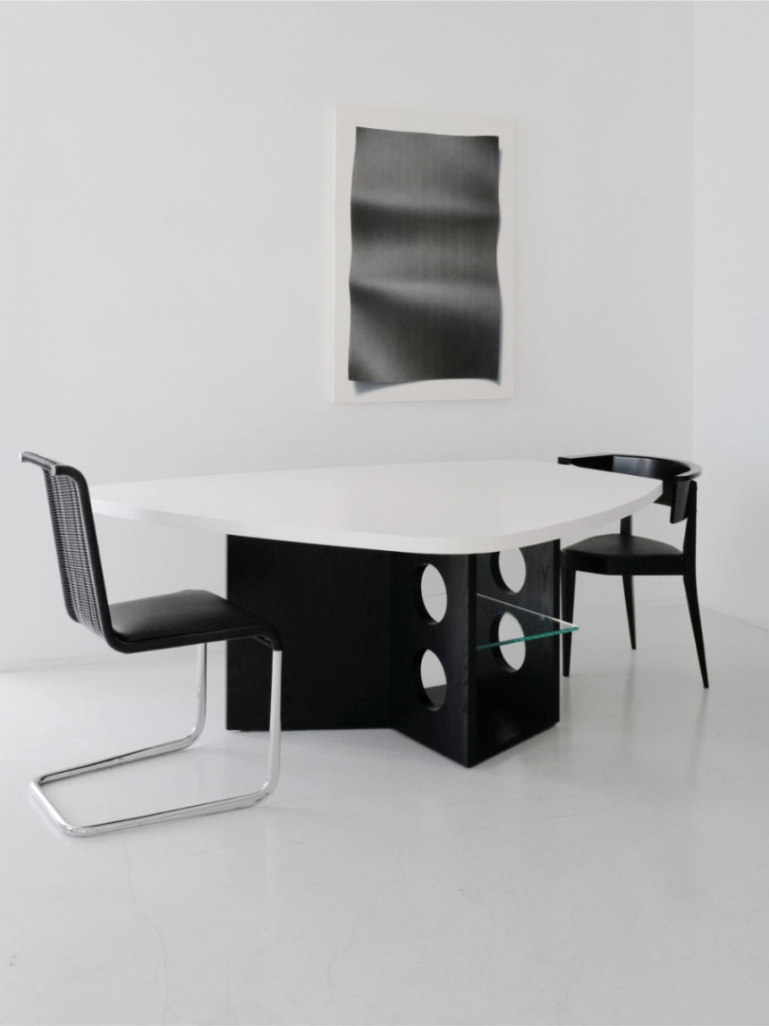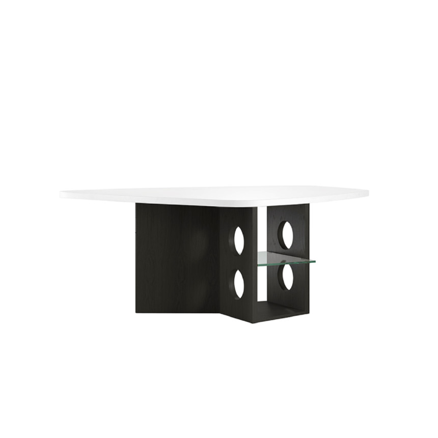 쉽게 찾아볼수 없는 비대칭적이고 조형적인 상판이 특징인 M21 테이블은 오픈된 공간 한가운데에 배치하거나 벽에 붙여 놓는등 다양한 연출이 가능한 점이 특징이며 다리 한 쪽에는 유리 선반이 있어 수납 효과가 있습니다.